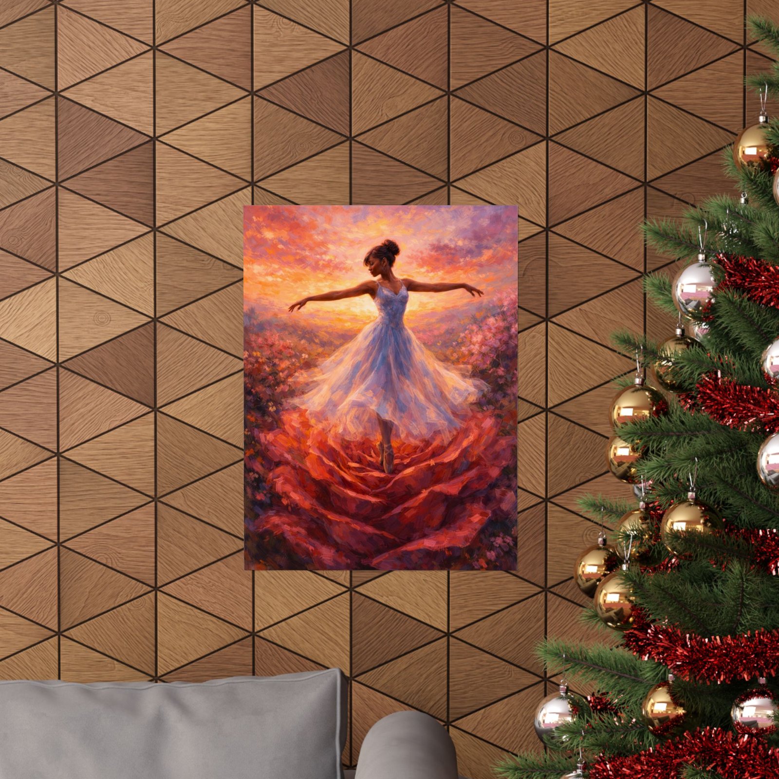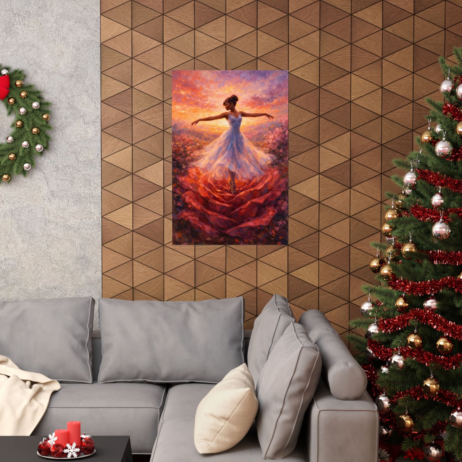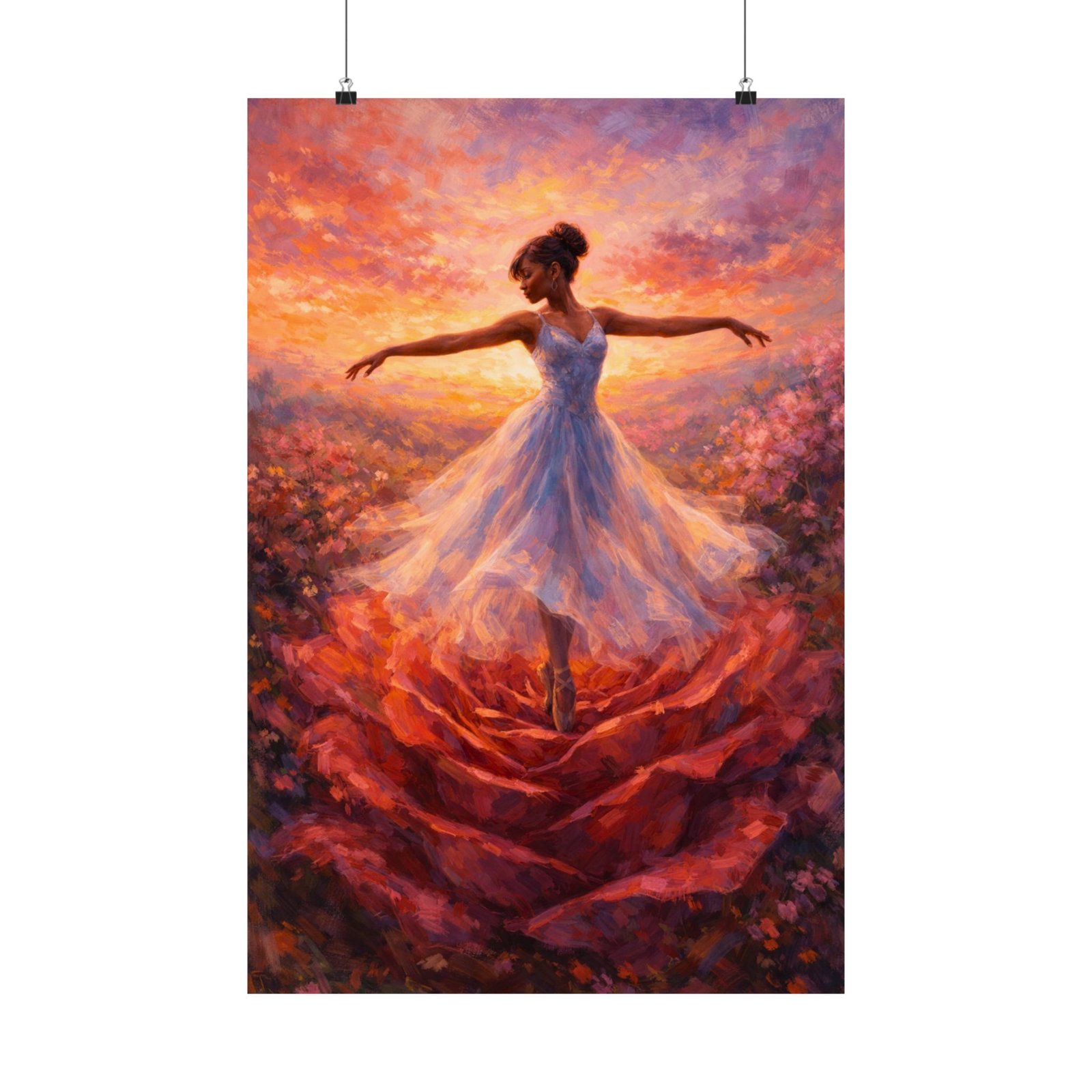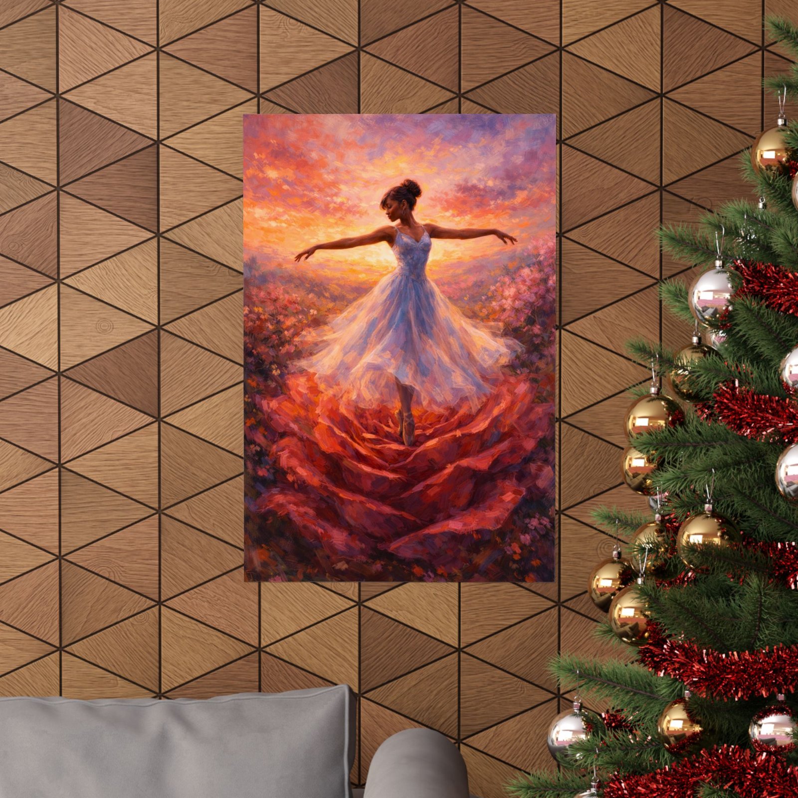 This matte vertical poster captures a poetic moment of emergence and grace: an abstract rose in full bloom giving rise to a woman who's balanced on her toes, poised like a ballerina mid-ascent. Created with expressive, visible brushstrokes, the artwork blends vivid reds, soft sunset hues, and flowing off-blue tones, giving the dress a sense of movement and breath. The figure’s elegant posture and calm strength evoke growth, artistry, and becoming, as if the bloom itself has learned to dance.