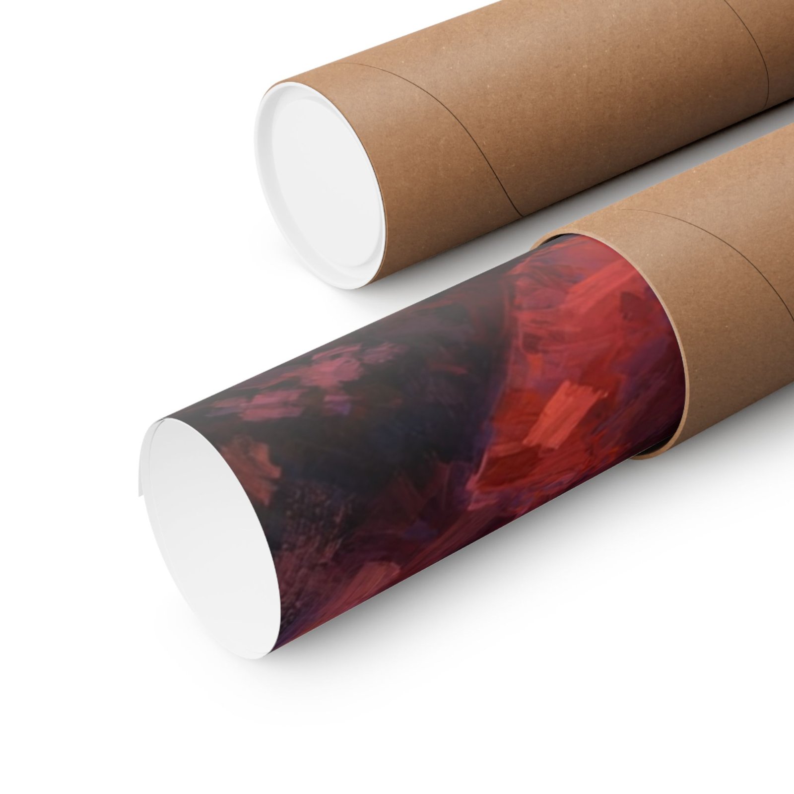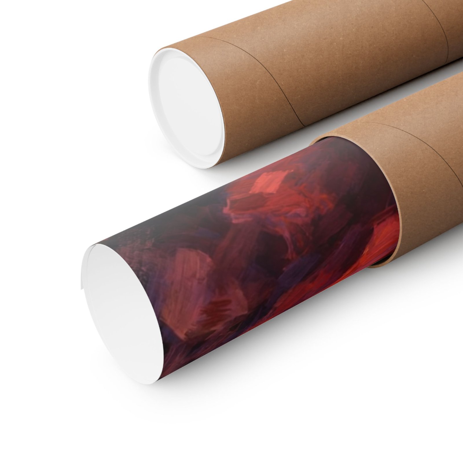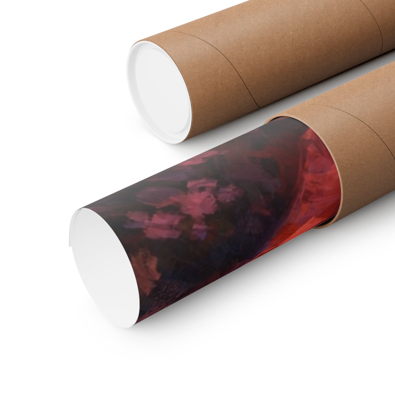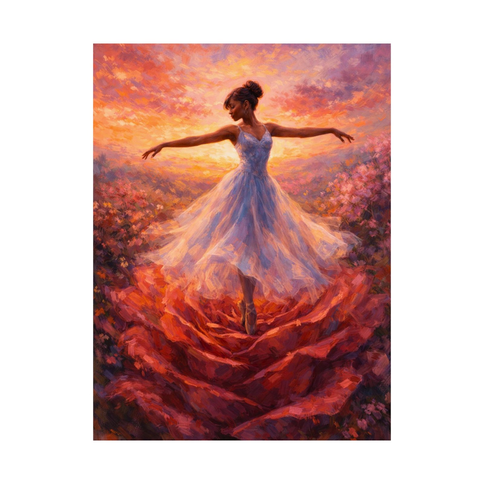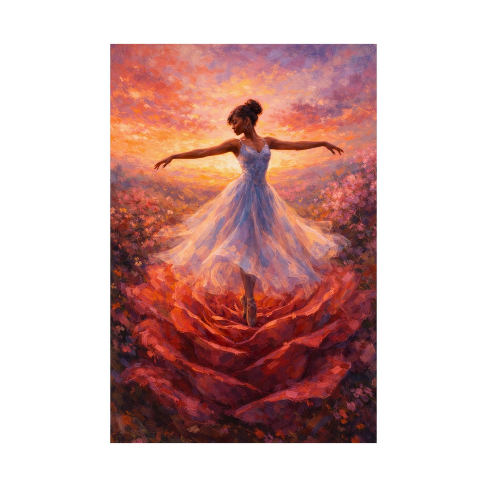 This matte vertical poster captures a poetic moment of emergence and grace: an abstract rose in full bloom giving rise to a woman who's balanced on her toes, poised like a ballerina mid-ascent. Created with expressive, visible brushstrokes, the artwork blends vivid reds, soft sunset hues, and flowing off-blue tones, giving the dress a sense of movement and breath. The figure’s elegant posture and calm strength evoke growth, artistry, and becoming, as if the bloom itself has learned to dance.