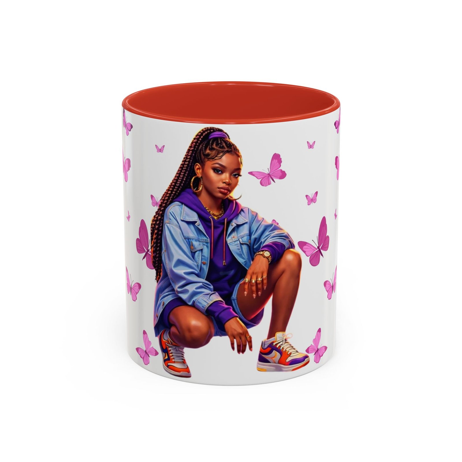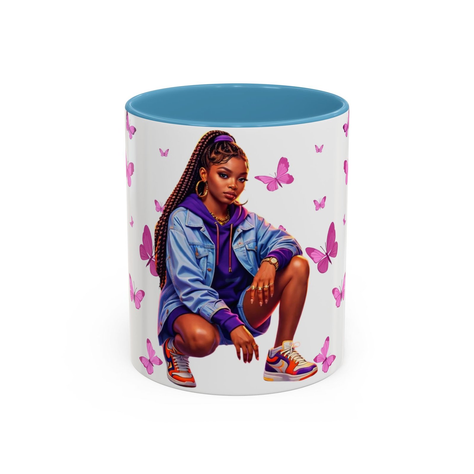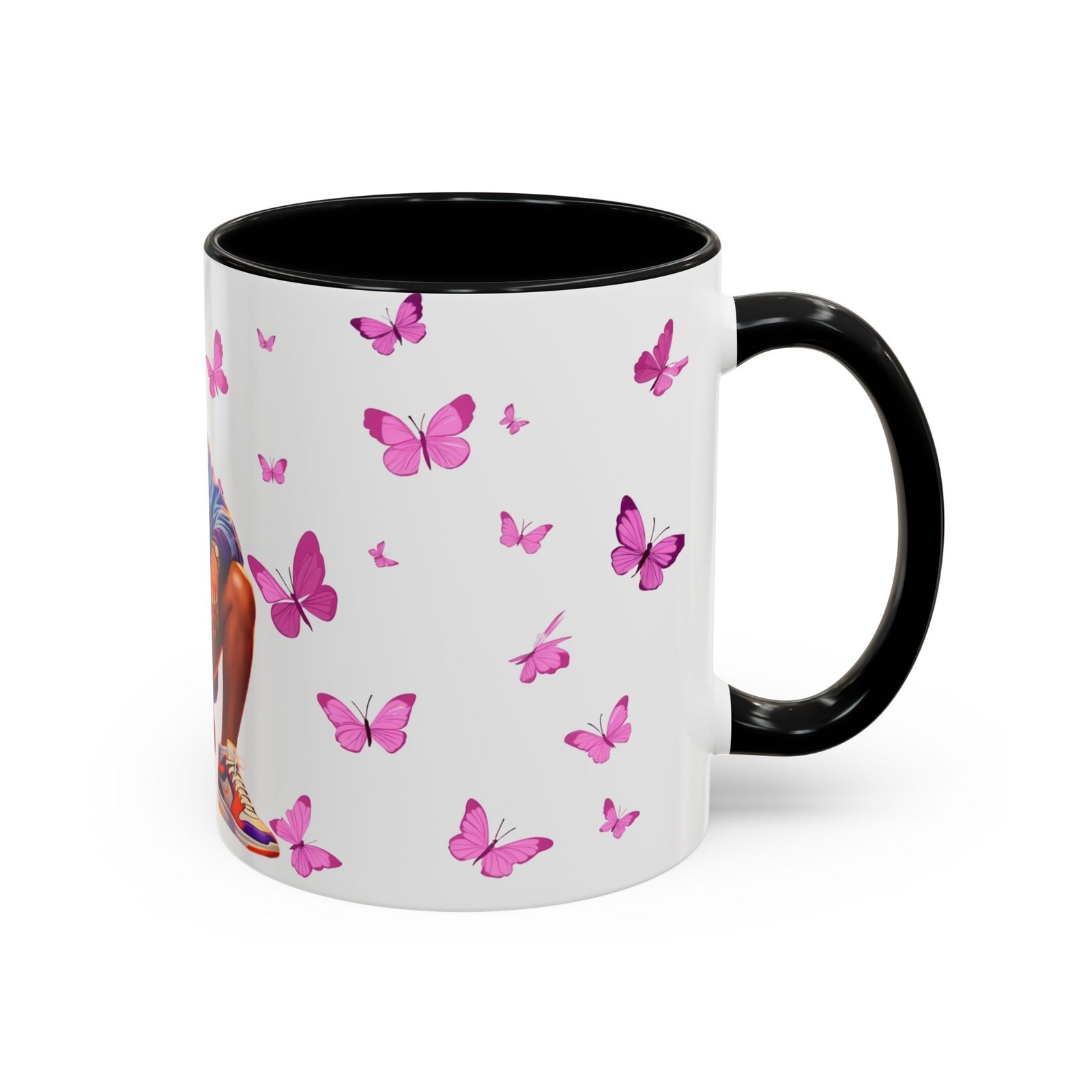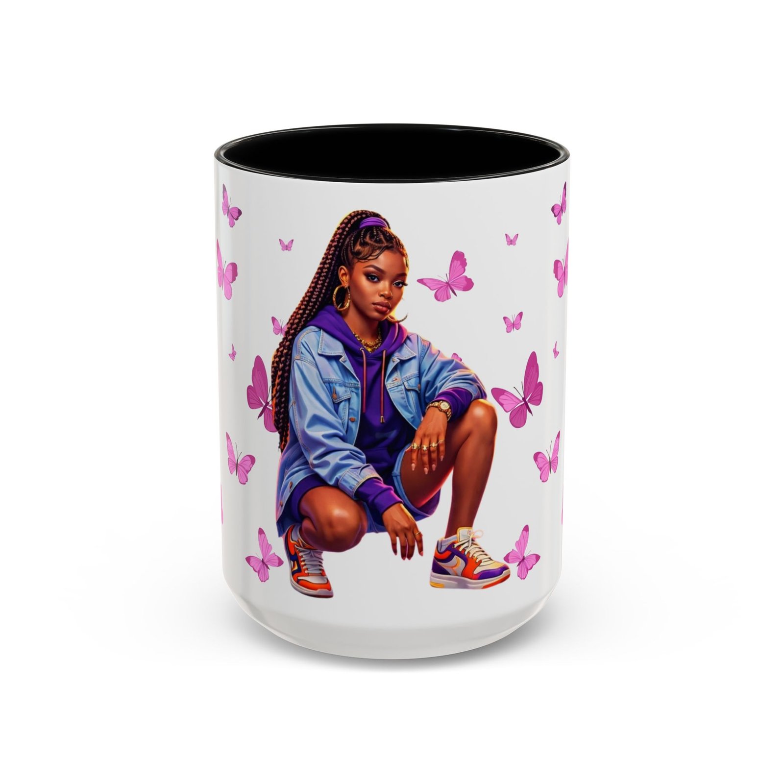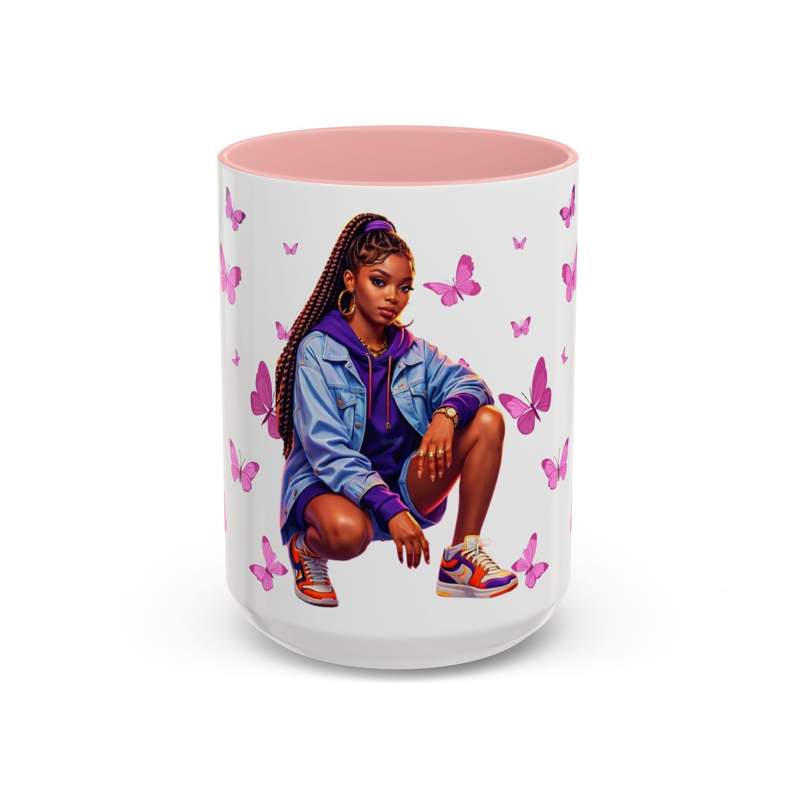 This ceramic accent mug is made for mornings that need a little attitude and a lot of self-expression. Featuring a bold, fashion-forward illustrated figure in streetwear, paired with soft pink butterflies, this design balances confidence with growth edge with grace. It’s playful without being loud, stylish without trying too hard.
