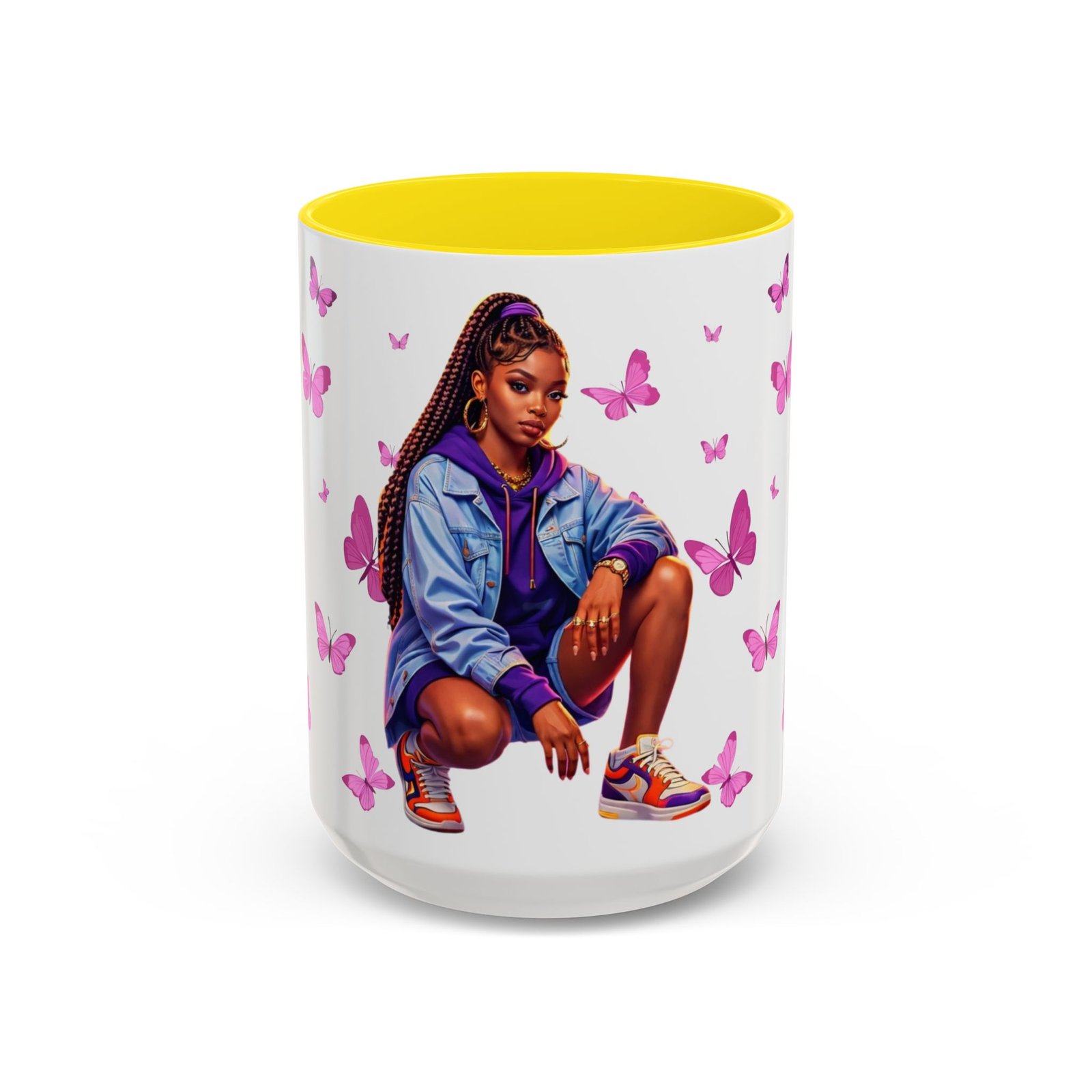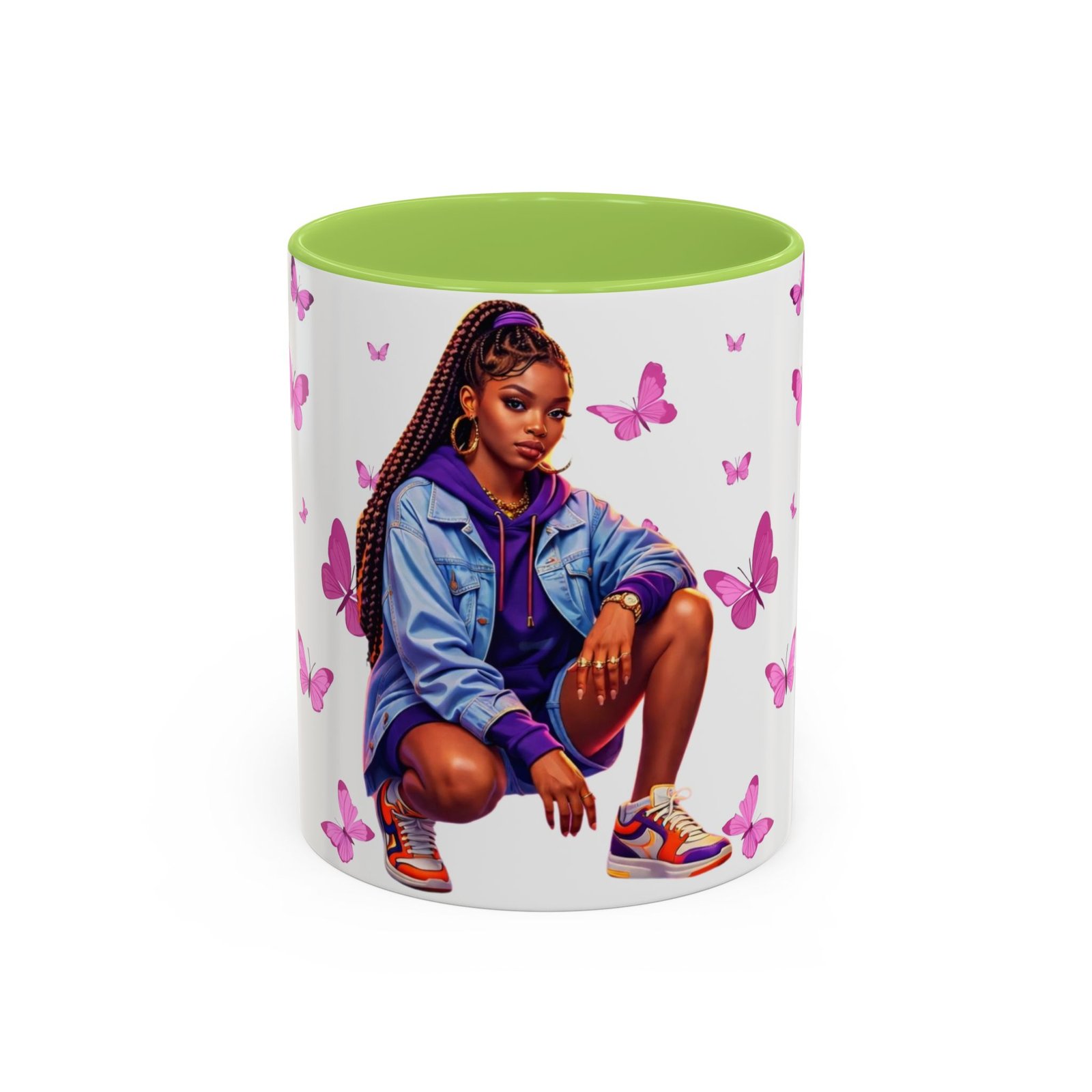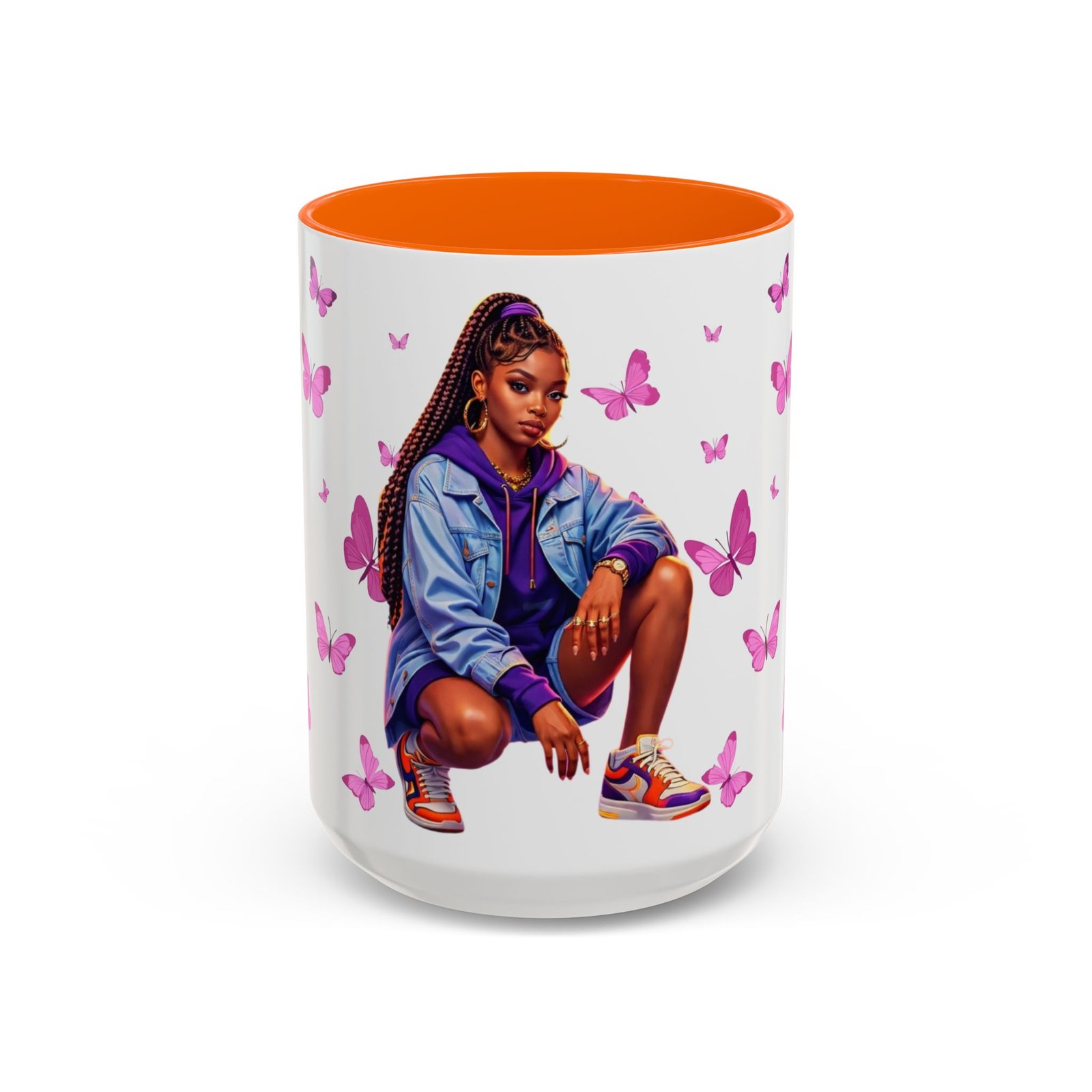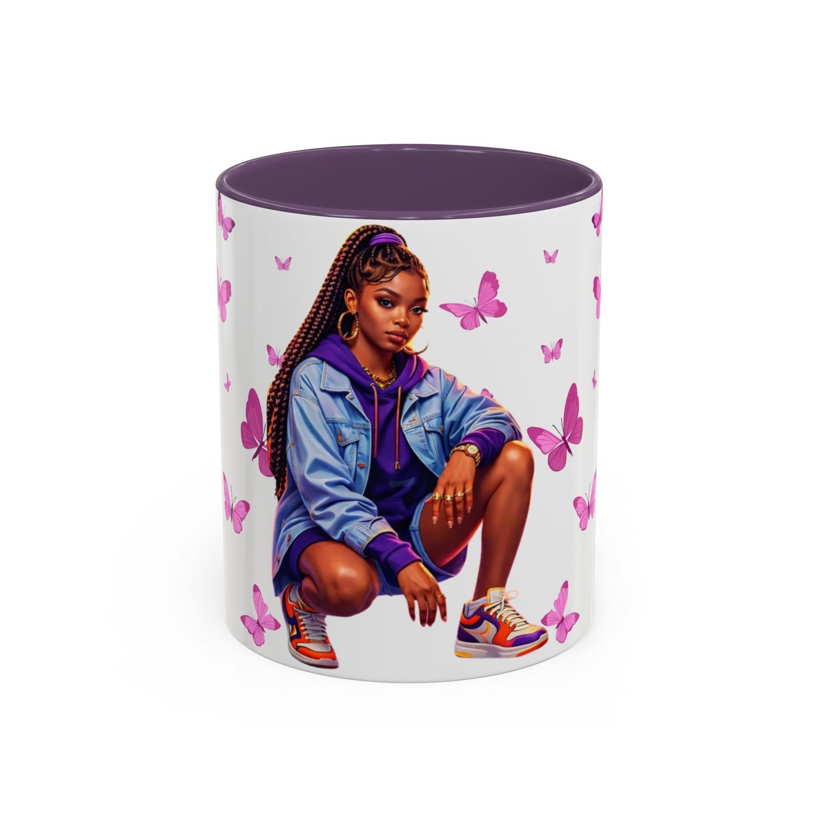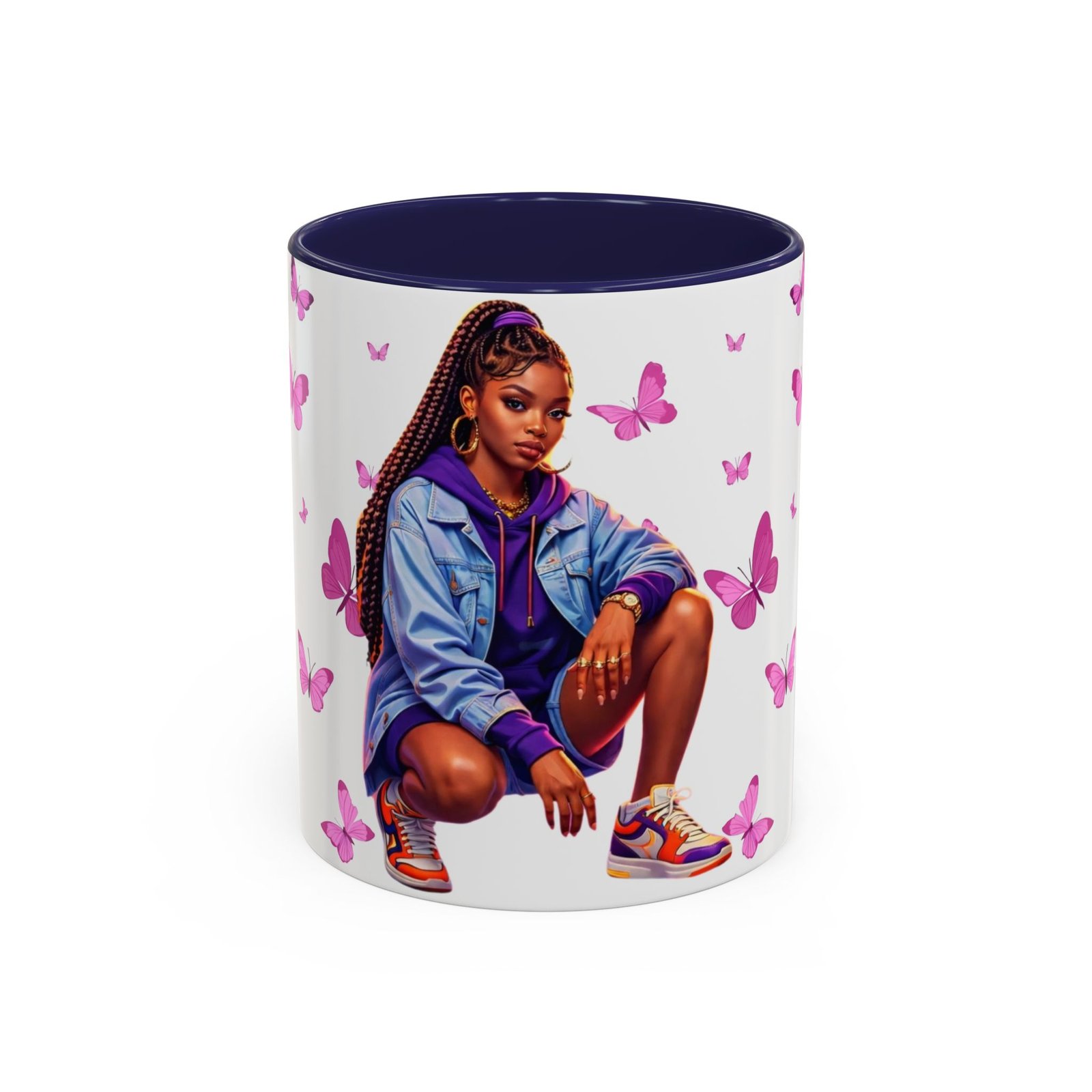 This ceramic accent mug is made for mornings that need a little attitude and a lot of self-expression. Featuring a bold, fashion-forward illustrated figure in streetwear, paired with soft pink butterflies, this design balances confidence with growth edge with grace. It’s playful without being loud, stylish without trying too hard.
