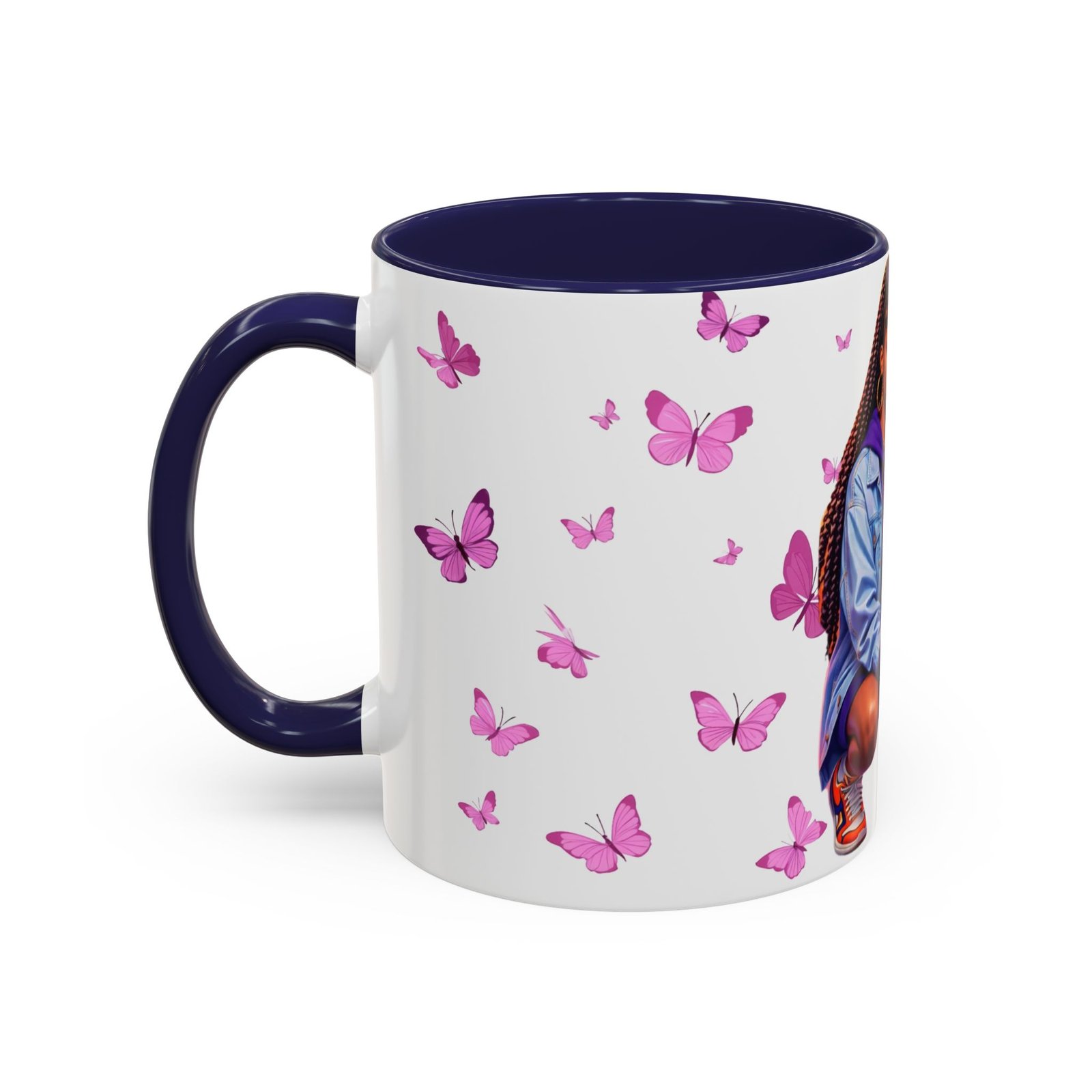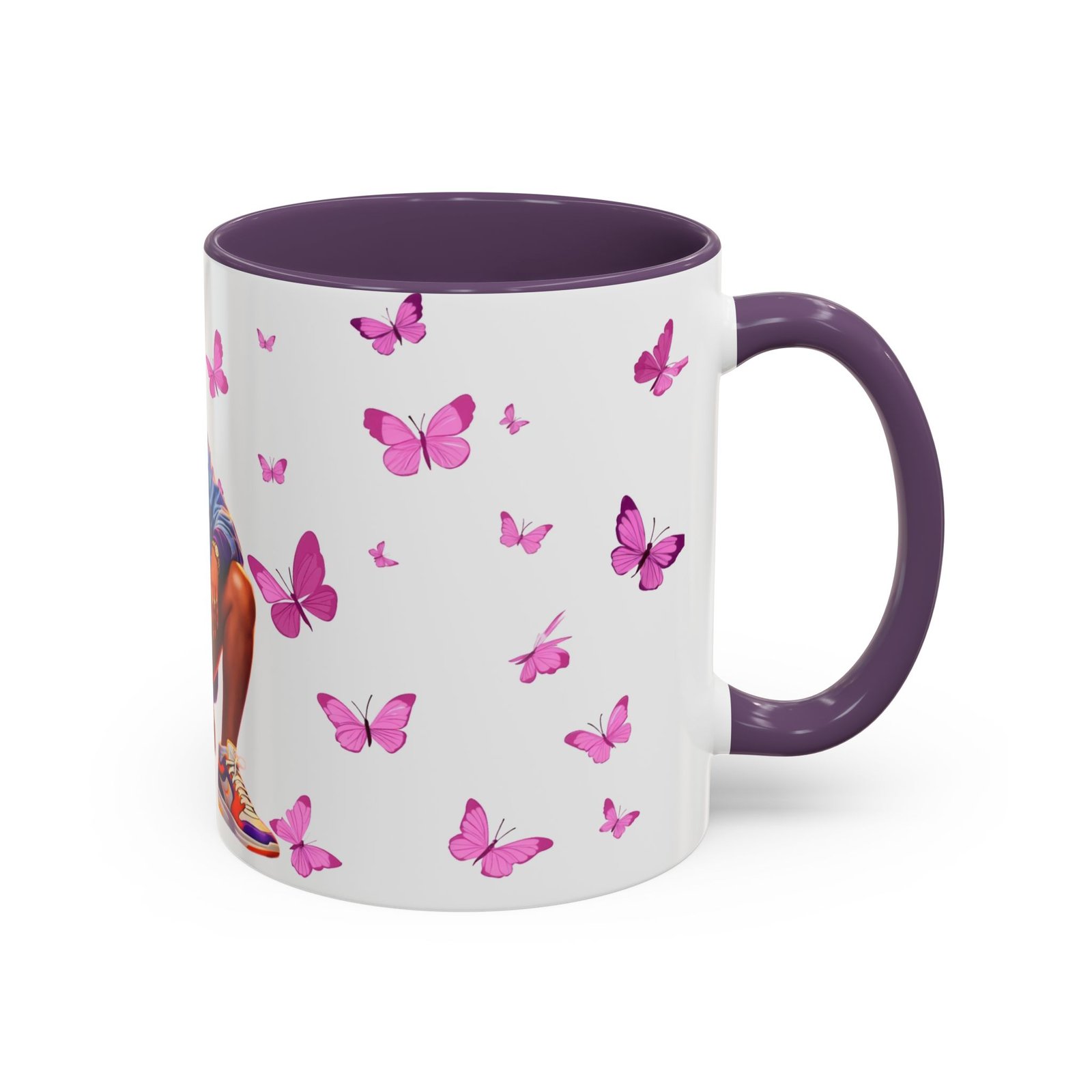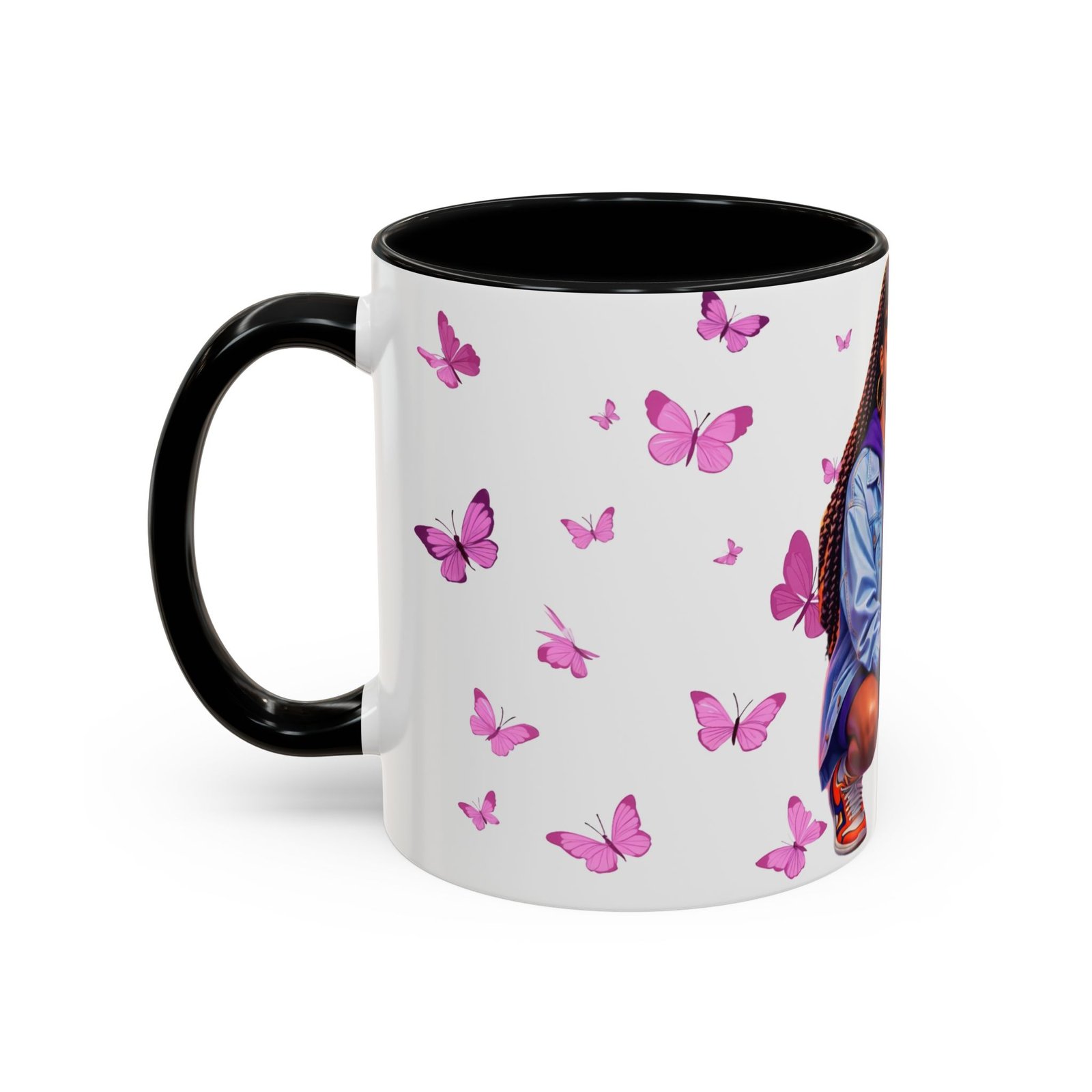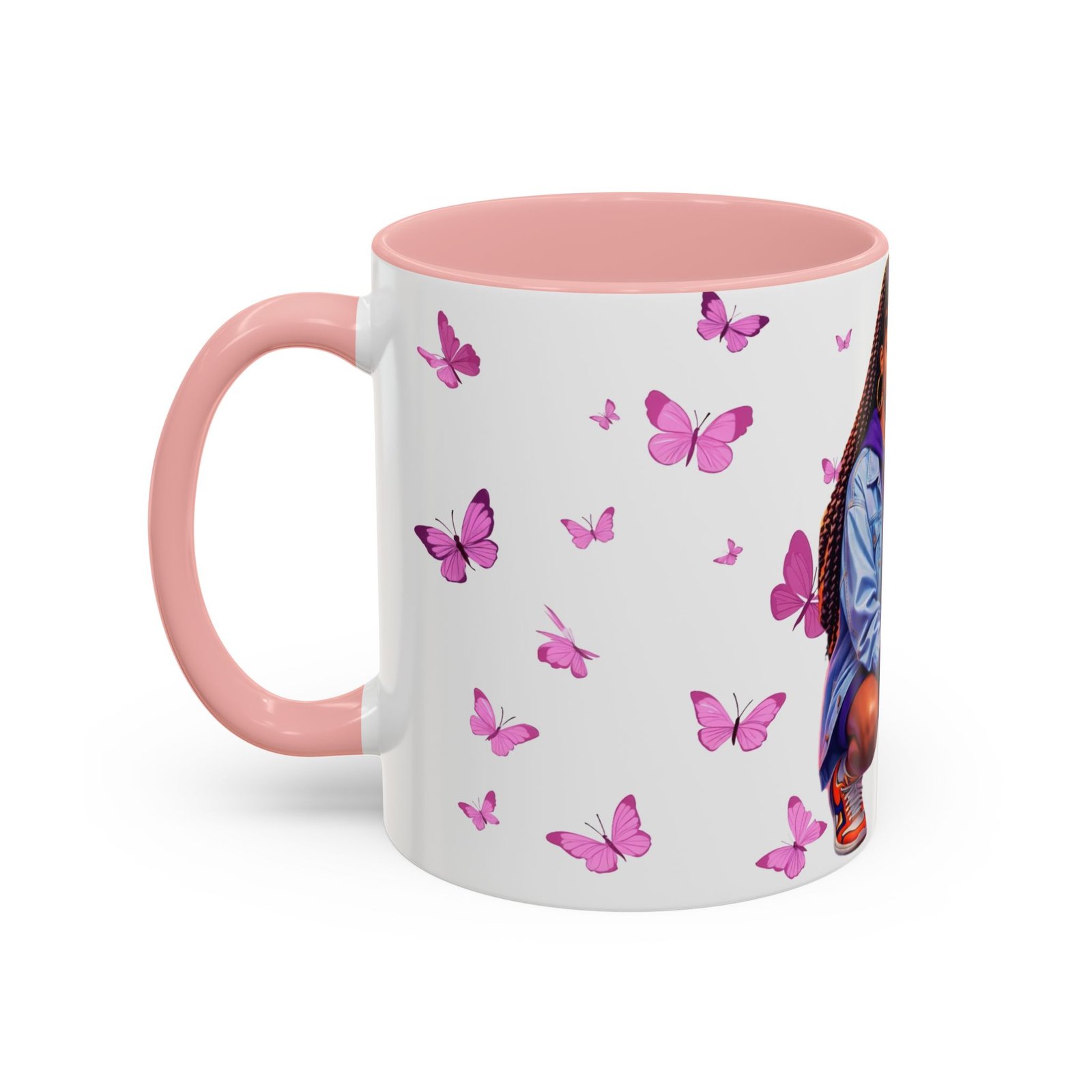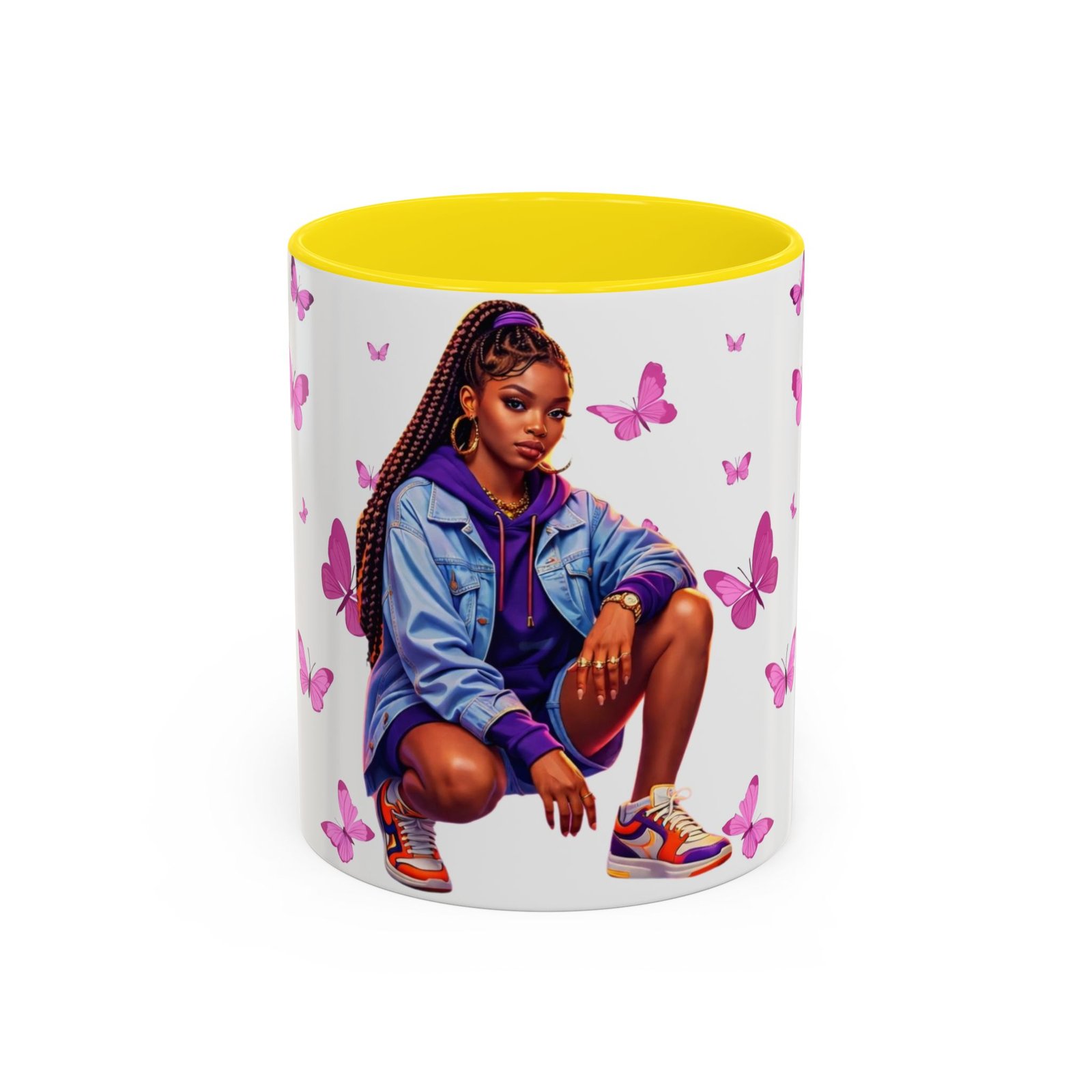 This ceramic accent mug is made for mornings that need a little attitude and a lot of self-expression. Featuring a bold, fashion-forward illustrated figure in streetwear, paired with soft pink butterflies, this design balances confidence with growth edge with grace. It’s playful without being loud, stylish without trying too hard.