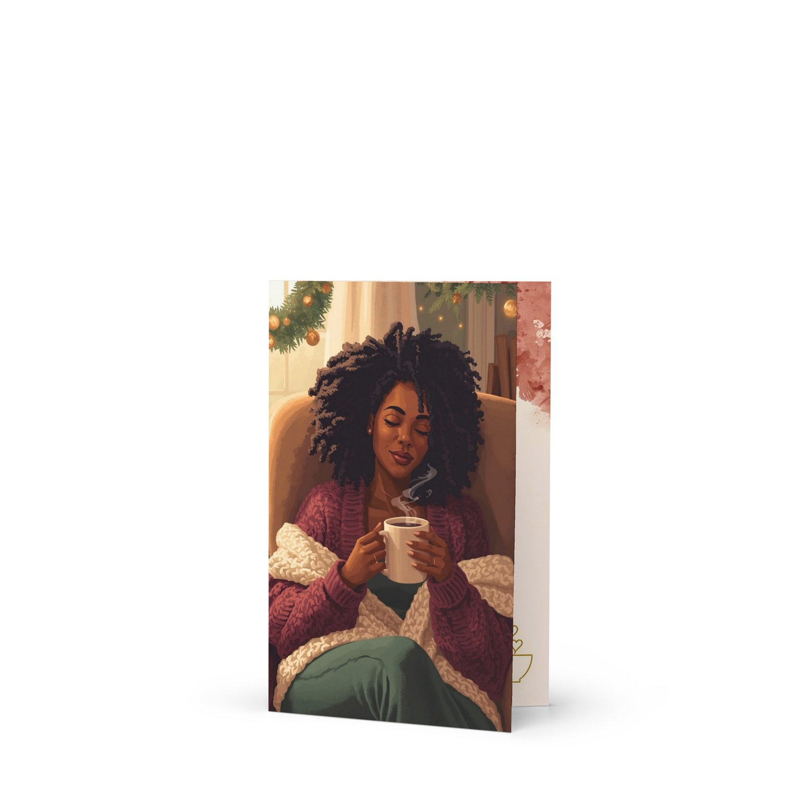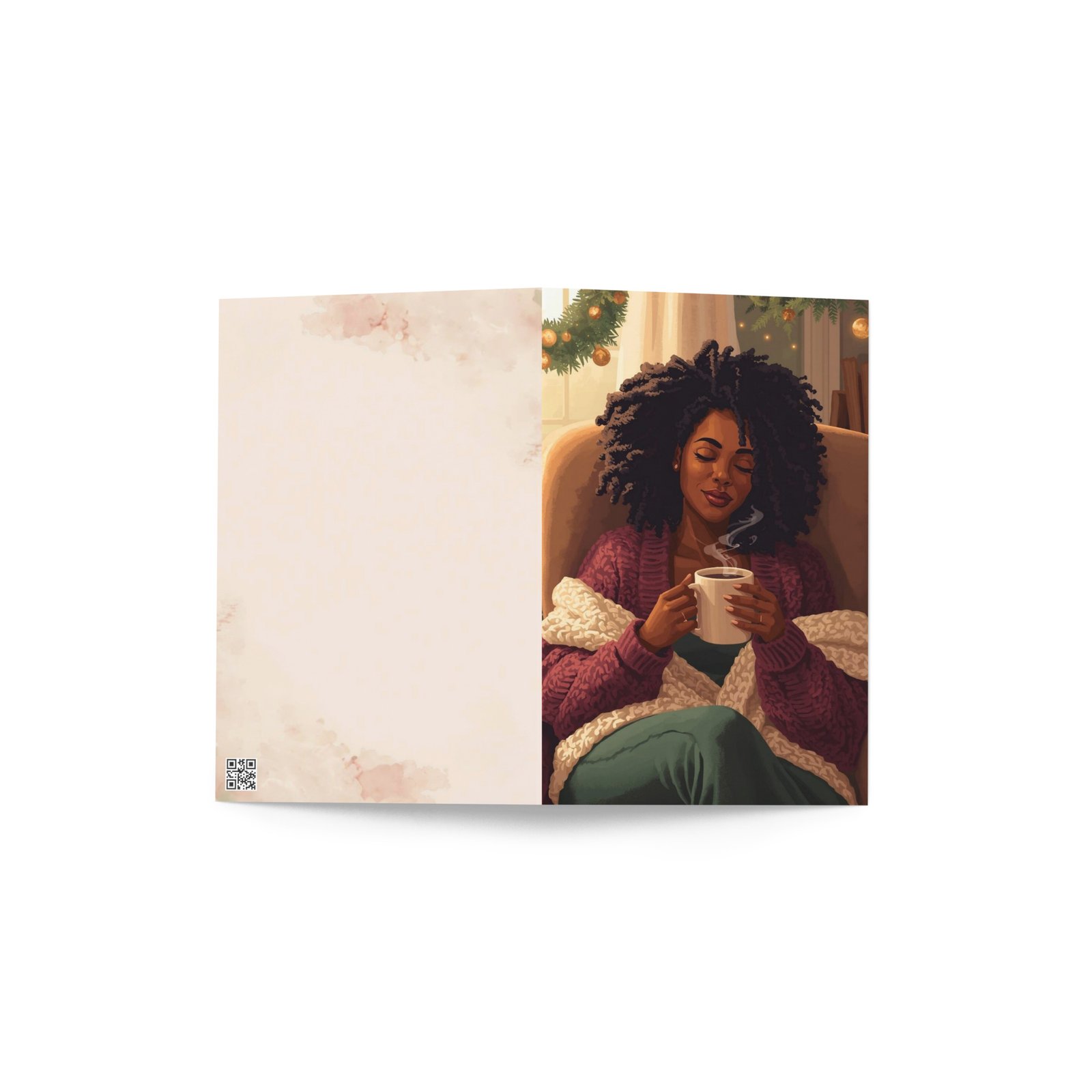 This Christmas card honors the woman everyone depends on, the one who pours into everyone else until her own cup runs dry. “The Nurturer” features intimate artwork of a Black woman in a rare moment of peace, wrapped in warmth, natural hair beautifully free, holding her favorite mug as she finally exhales. This isn’t her “on” for the world; this is her resting, restoring, being.