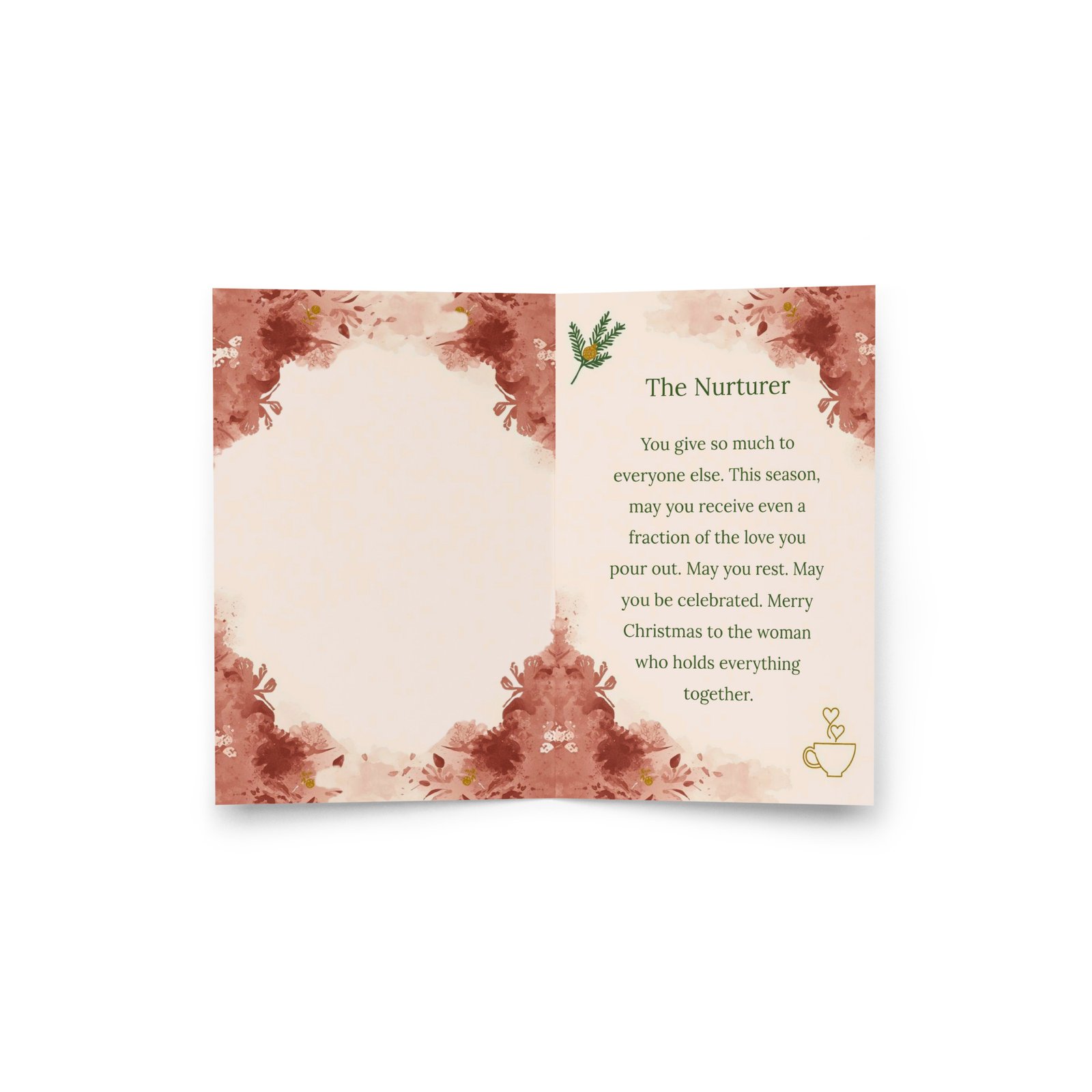 The color palette of warm burgundy, soft gold, cream, and forest green creates an atmosphere of comfort, warmth, and sacred rest. This card gives her permission to receive what she’s always giving.