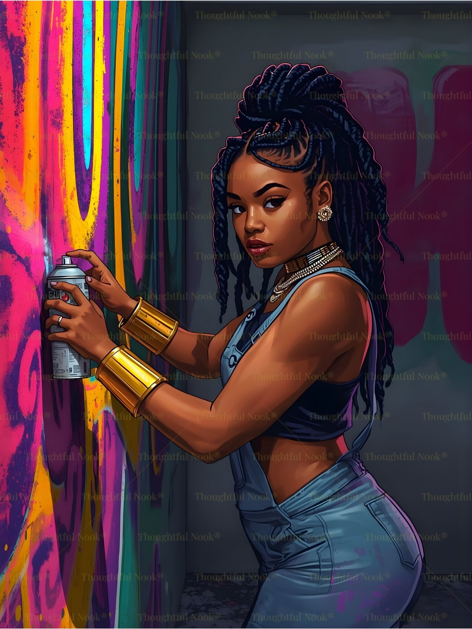 Celebrate Black creativity and urban artistry with this stunning digital illustration. This powerful canvas features a confident Black woman artist in her element, spray paint in hand, surrounded by vibrant graffiti colors that pop with energy.